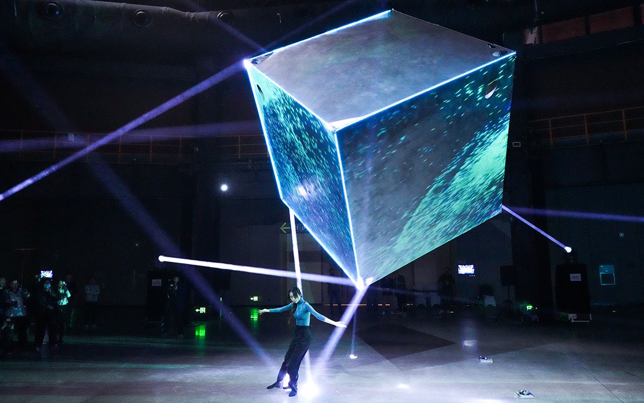 图为3月27日,北京石景山,舞者在零重力魔方下跳舞。(中新社)