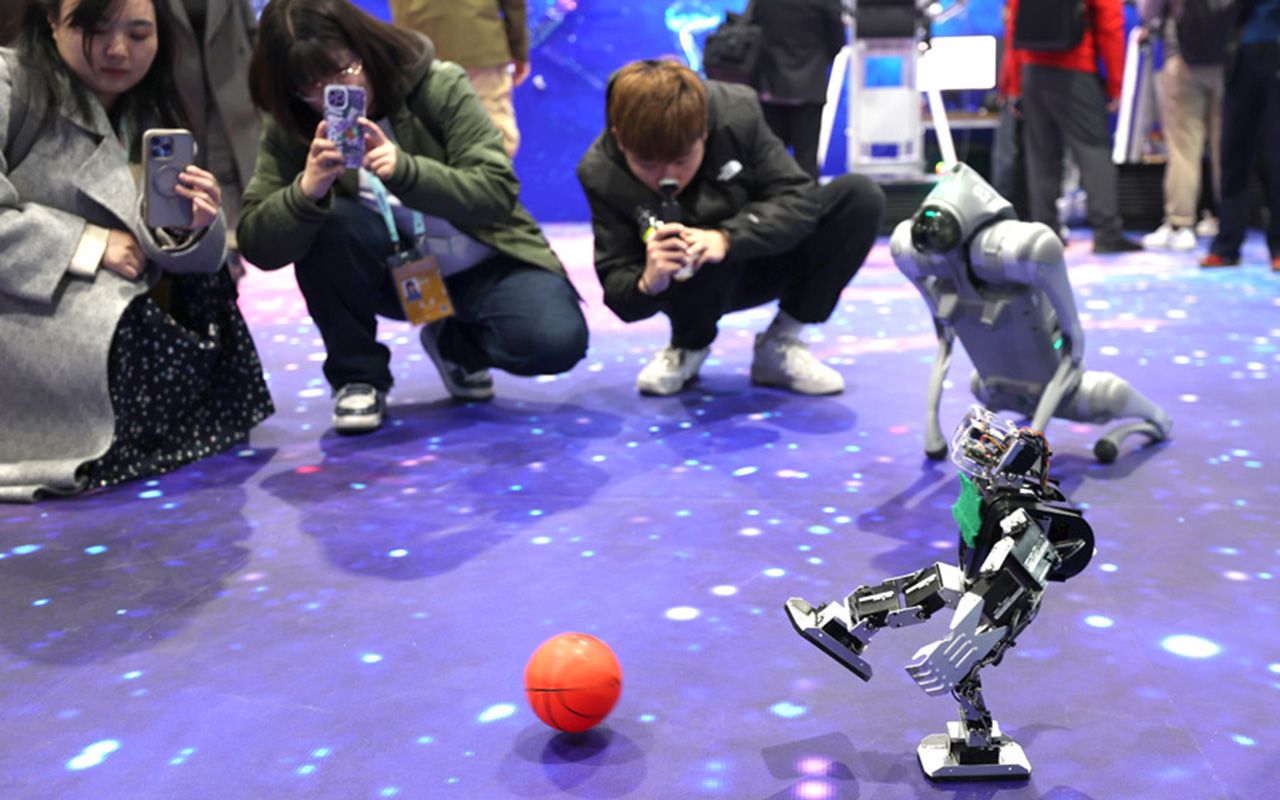 图为3月27日,北京石景山,MINI机器人演示踢足球。(中国日报网)
