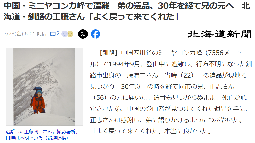 1994年9月,来自北海道钏路市的工藤润二在攀登位于中国四川省的贡嘎山时遇险失踪。30多年后,他的遗物在当地被发现。(图/《北海道新闻》报道截图)