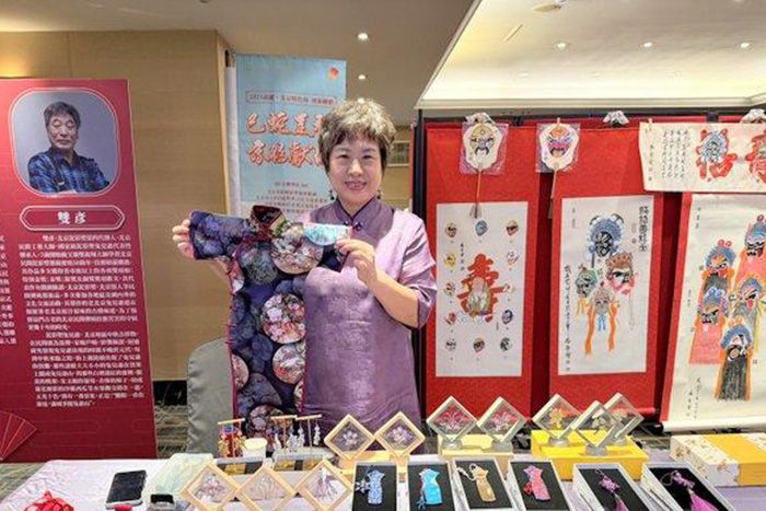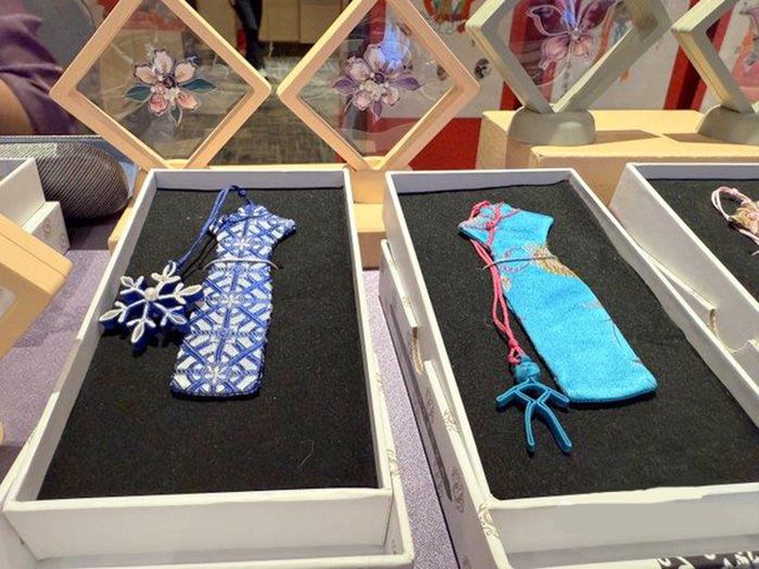 30日,张凤兰向民众介绍了旗袍结合三项非遗技术,包含精致旗袍制作技艺、中国结、盘扣,她也展示了许多相关创作,譬如旗袍书签,结合冬奥雪花、甲骨文文字、梅兰竹菊、四合如意纹呈现不同的款式,还有许多胸针、压襟、香囊、项炼等饰品,让人目不转睛。