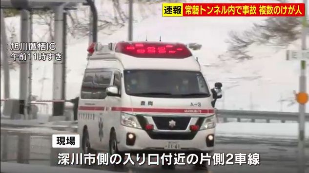 事故现场位于日本北海道深川市一侧隧道入口附近的双车道区域,当地警方与消防部门正在调查事故原因。