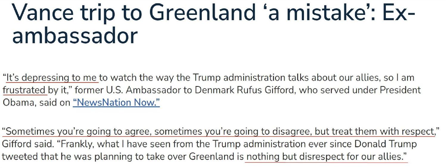 美国前驻丹麦大使吉福德近日在接受采访时也认为,美国政府在格陵兰岛问题上缺乏最起码的尊重。