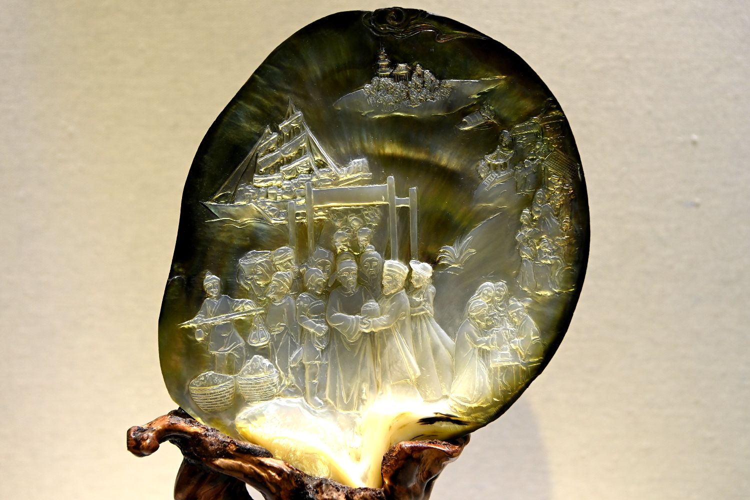 图为翁清香的贝雕作品《海上丝绸》,在黑蝶贝上雕刻古代海上丝绸之路重要始发港漳州月港的贸易盛景。(图/中新社)
