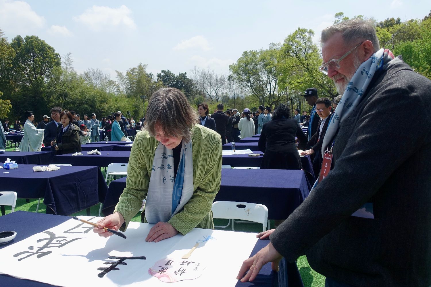 4月1日,第四十一届兰亭书法节在浙江绍兴兰亭开幕,中外书法家泼墨挥毫。图为外国书法爱好者现场创作。(图/中新社)