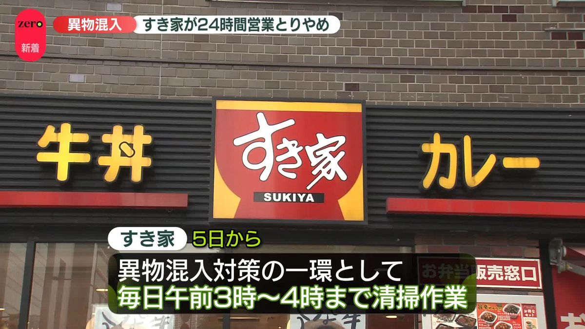 今年以来,Sukiya发生了数起异物混入事件:在鸟取县某门店提供的味噌汤中发现老鼠;在东京都昭岛市某门店,顾客购买的外带餐食中发现了蟑螂残骸。因此,自3月31日起,除位于购物中心内的部分门店外,其他所有门店暂停营业。公司随后对店铺进行了彻底清扫,并加强了防止虫鼠侵入的卫生管理措施。在4月3日公布的再发防止对策中,Sukiya表示:将取消除购物中心内门店以外的24小时营业制度,每天凌晨3点至4点设为集中清扫时间;对于老旧门店将依序进行改装,将厨房结构变更为更便于清洁的设计。