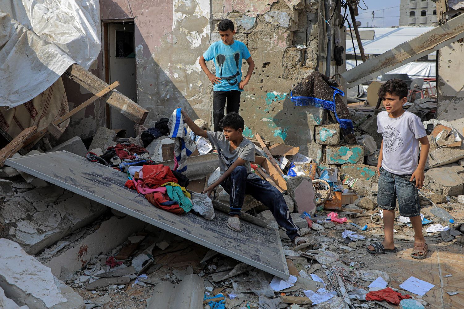 图为孩子们在加沙地带南部城市拉法一处废墟中搜寻物品。(图/新华社)