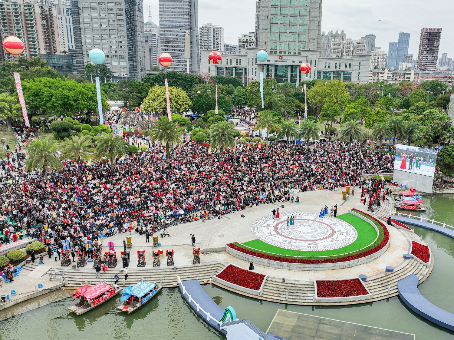 3月31日,中国农历三月初三,广西南宁民歌湖上演多种热闹喜庆的欢庆活动。图为民歌湖主舞台上演的歌圩活动吸引民众围观。(图/中新社)