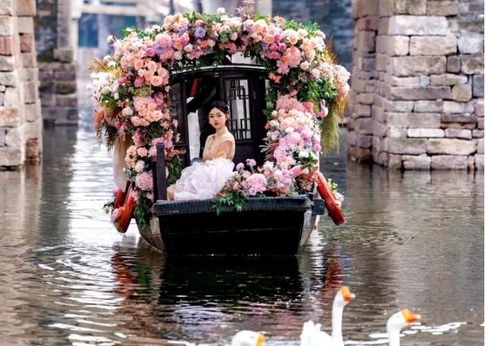 2025年,海宁盐官古城内,游客乘花船拍照打卡。(图/中新网)
