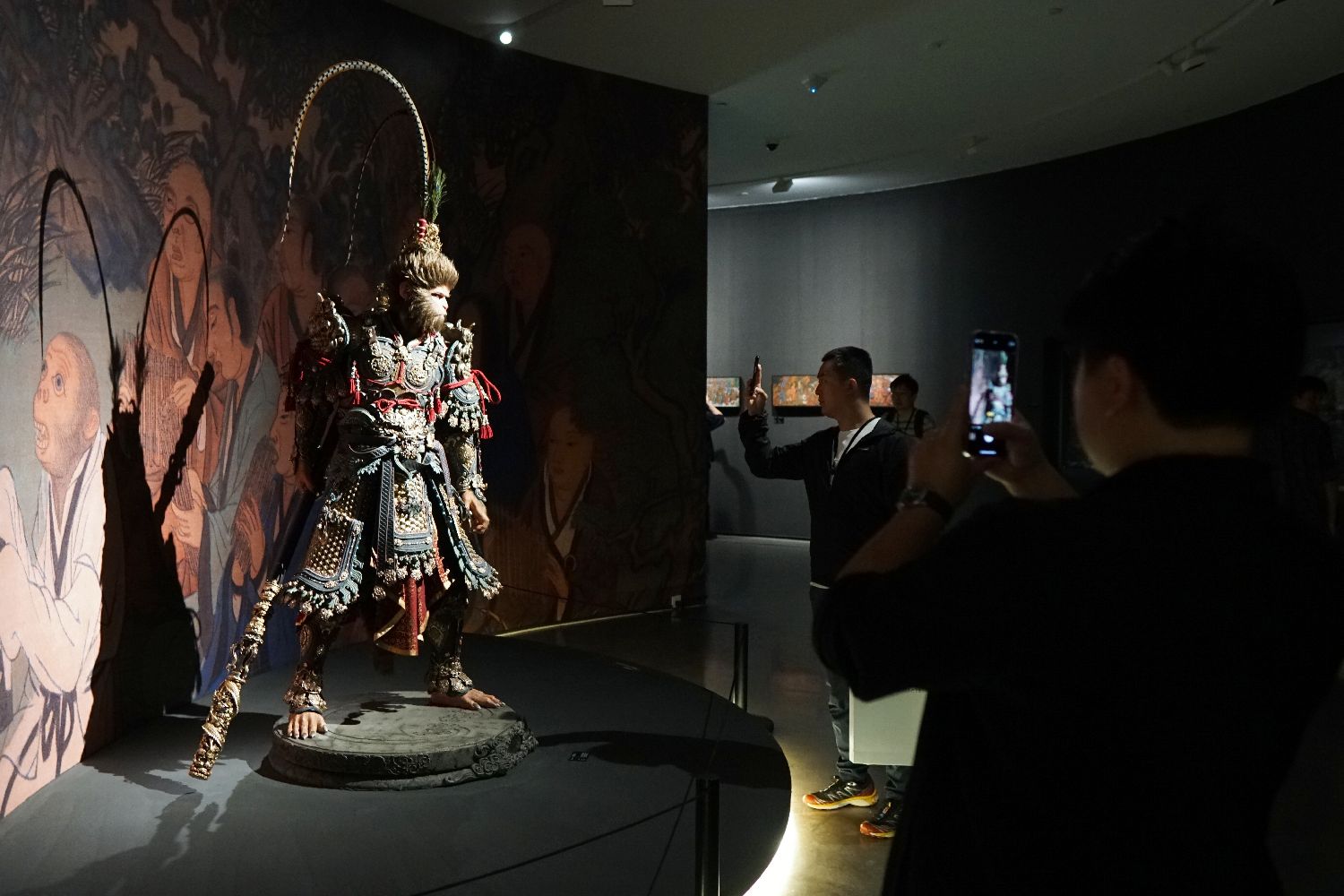 4月9日,参观者在“天命人”全身像前拍照。当日,“黑神铸炼”——「黑神话:悟空」主题艺术展在浙江杭州中国美术学院美术馆开幕,展出400多幅原画作品、200多件实物等。展览将持续至5月21日。(图/中新社)