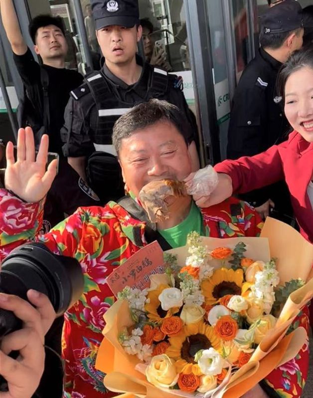 据悉,林江出站后,马上被鲜花、招牌、闪光灯等包围。众多接站人员高呼“欢迎卤鹅哥”。尽管当天荣昌区气温将近30℃,林江仍穿着标志性的大花袄。