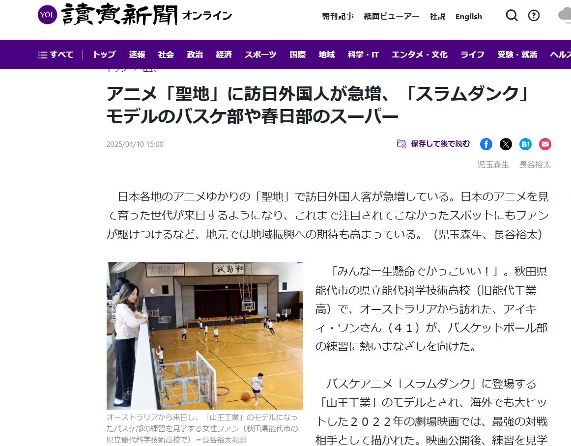 据悉,该校是篮球动画《灌篮高手》中登场的“山王工业高中”的原型。在海外也大受欢迎的2022年《灌篮高手》剧场版电影中,“山王工业高中”被描绘为主角团最强劲的对手。该电影上映后,前往能代科学技术县立高中观摩篮球部练习的外国人明显增多。该篮球部队长佐藤悠斗选手(高三)说:“起初我很奇怪为什么会有人来观摩普通的社团活动,但现在(被观摩)成为了一种鼓励。”