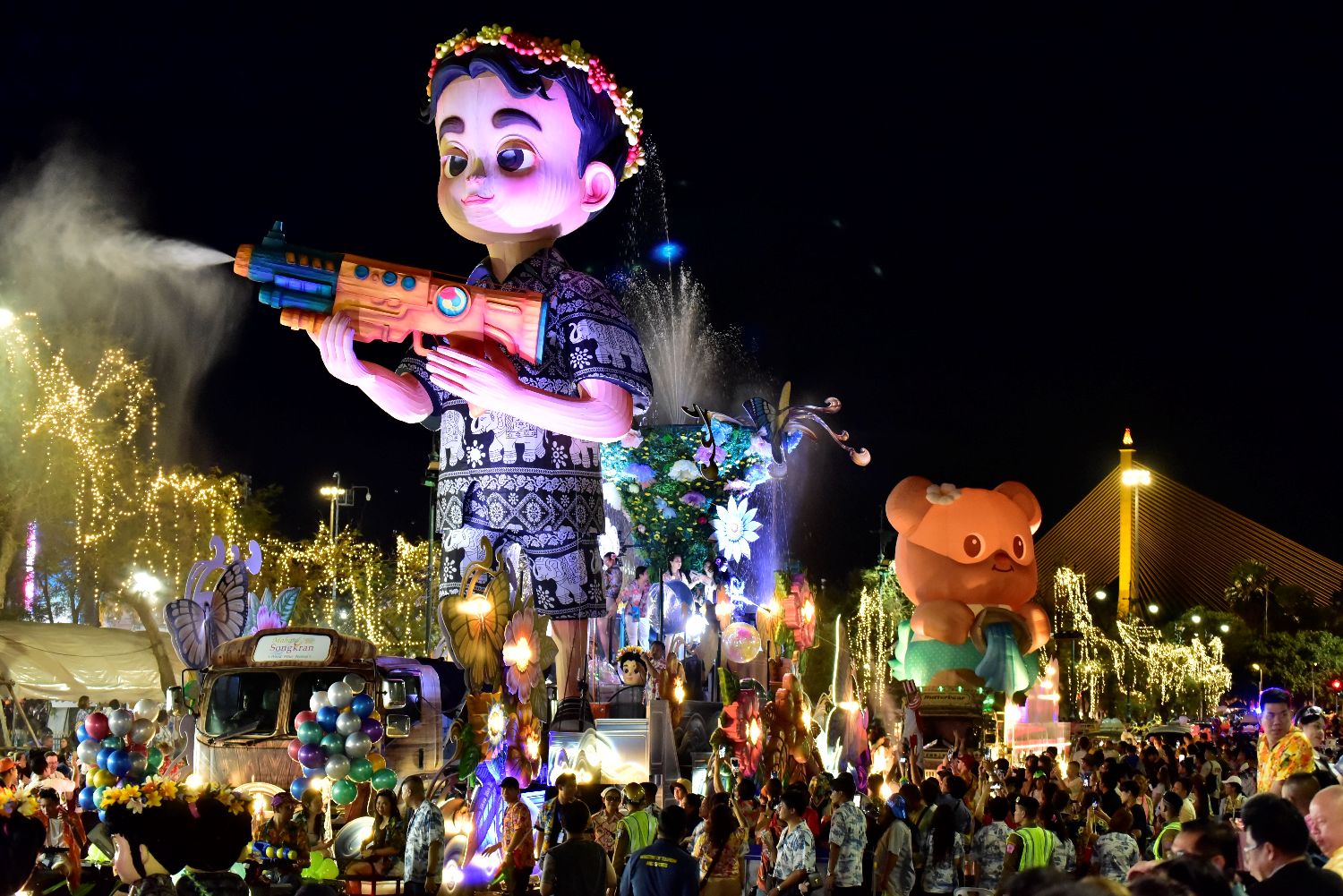 当地时间12日晚,泰国政府在曼谷王家田广场正式启动“2025玛哈世界泼水节”庆祝活动。图为活动中巡游的主题花车。(图/中新社)