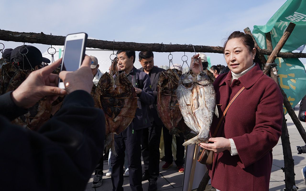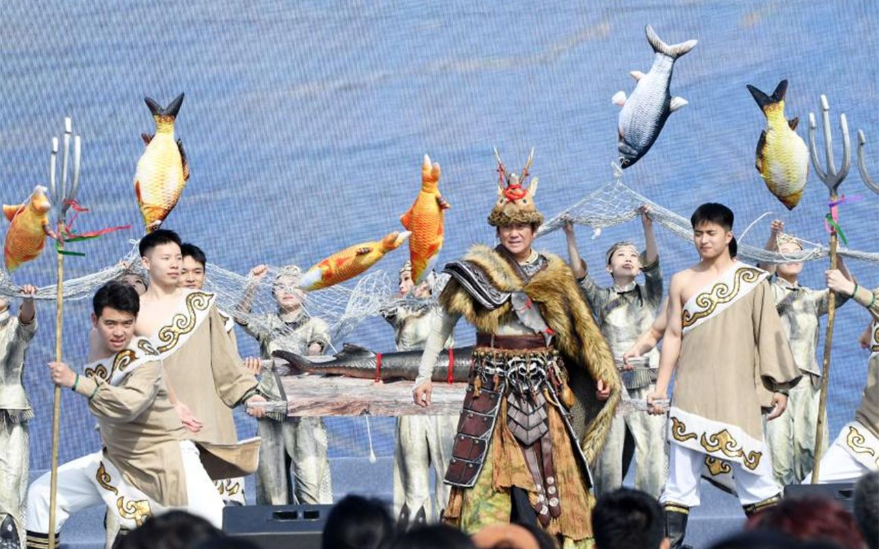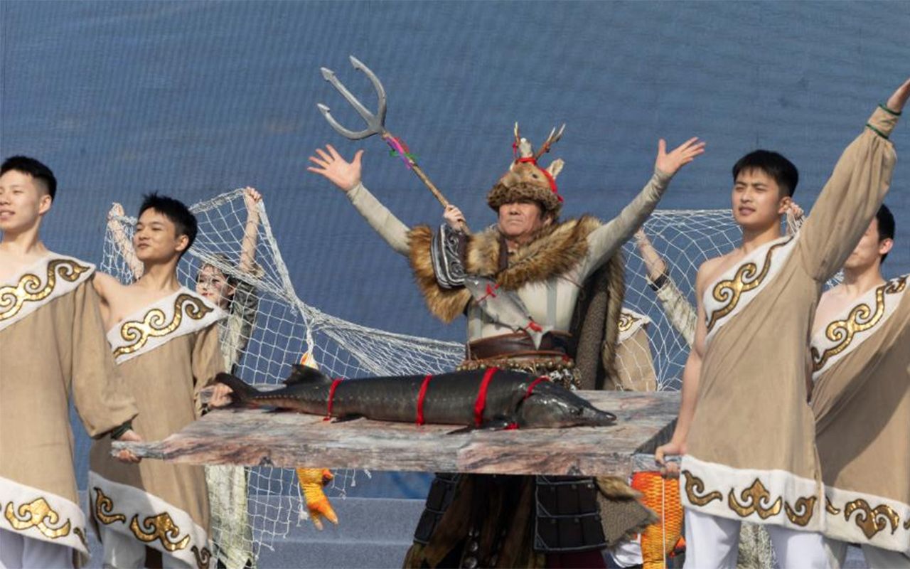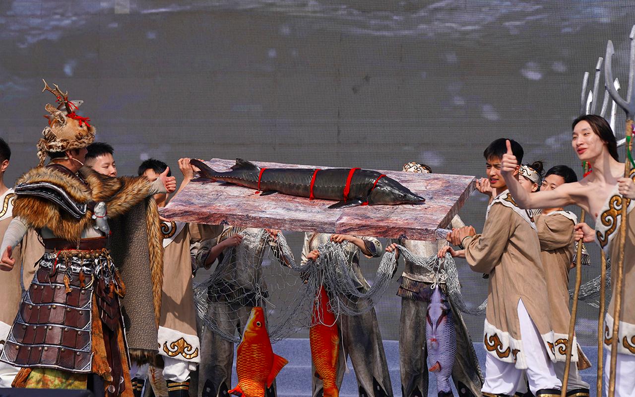 图为4月16日,演职人员在2025哈尔滨市开江民俗文化周启动仪式现场展示“头鱼”。(新华社)