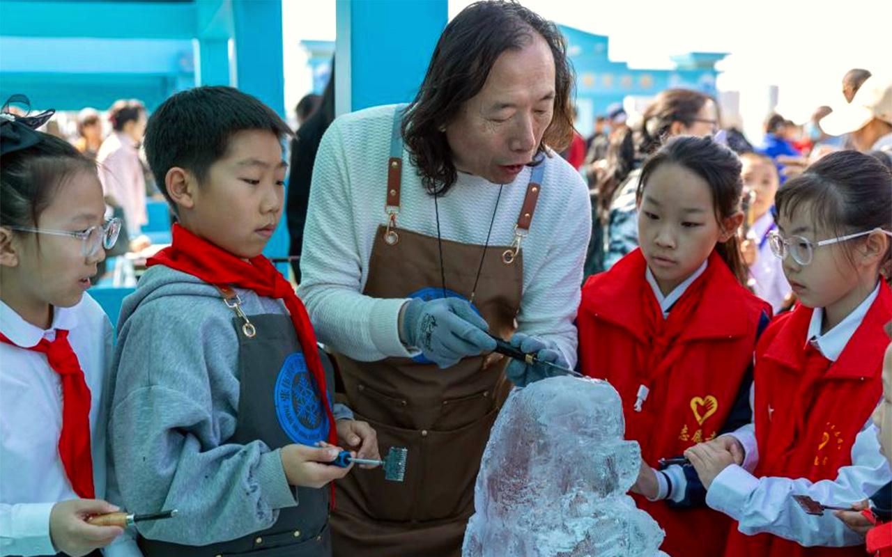 图为4月16日,非遗传承人在2025哈尔滨市开江民俗文化周启动仪式现场展示冰雕技巧。(新华社)