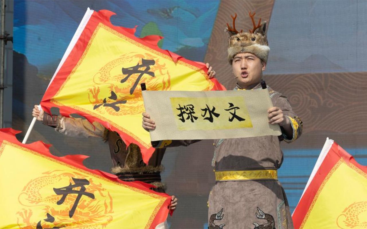 图为4月16日,演职人员在2025哈尔滨市开江民俗文化周启动仪式现场朗读探水文。(新华社)