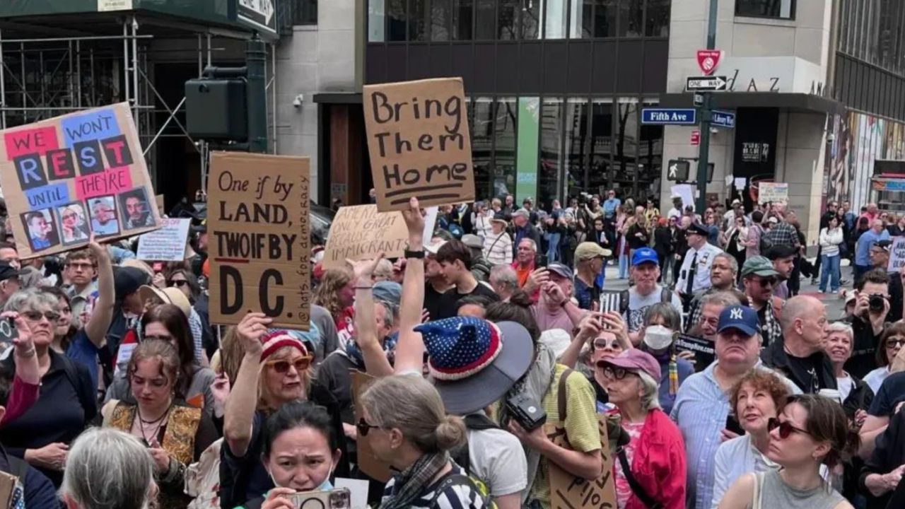 4月19日,人们在美国纽约街头参加抗议活动。新华社记者刘亚南摄