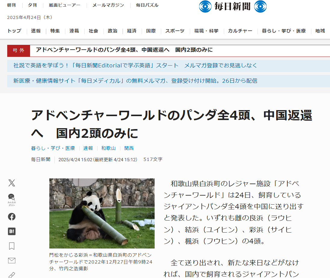 位于和歌山县白滨町的“冒险大世界”24日宣布,将把饲养的4只大熊猫全部返还中国。(图/《每日新闻》报道截图)