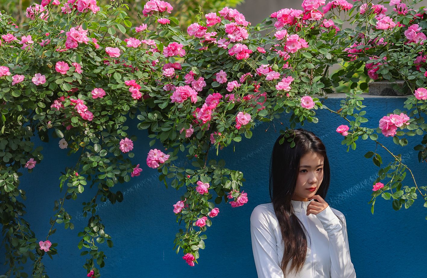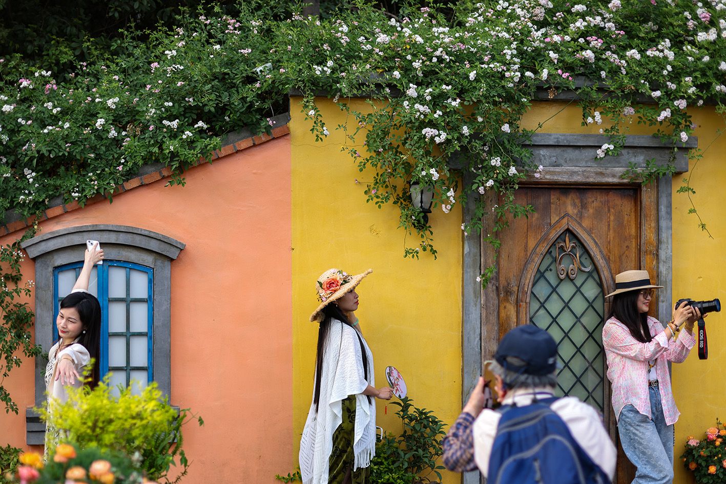 4月23日,江苏南京,年轻人在街头盛开的花朵前拍摄照片。暮春时节,南京街头巷尾种植的花卉植被攀上墙头,美丽“上线”。(中新社)