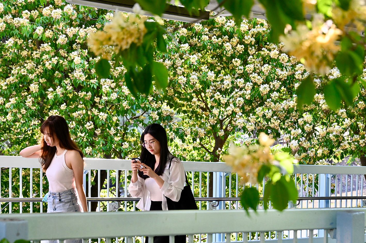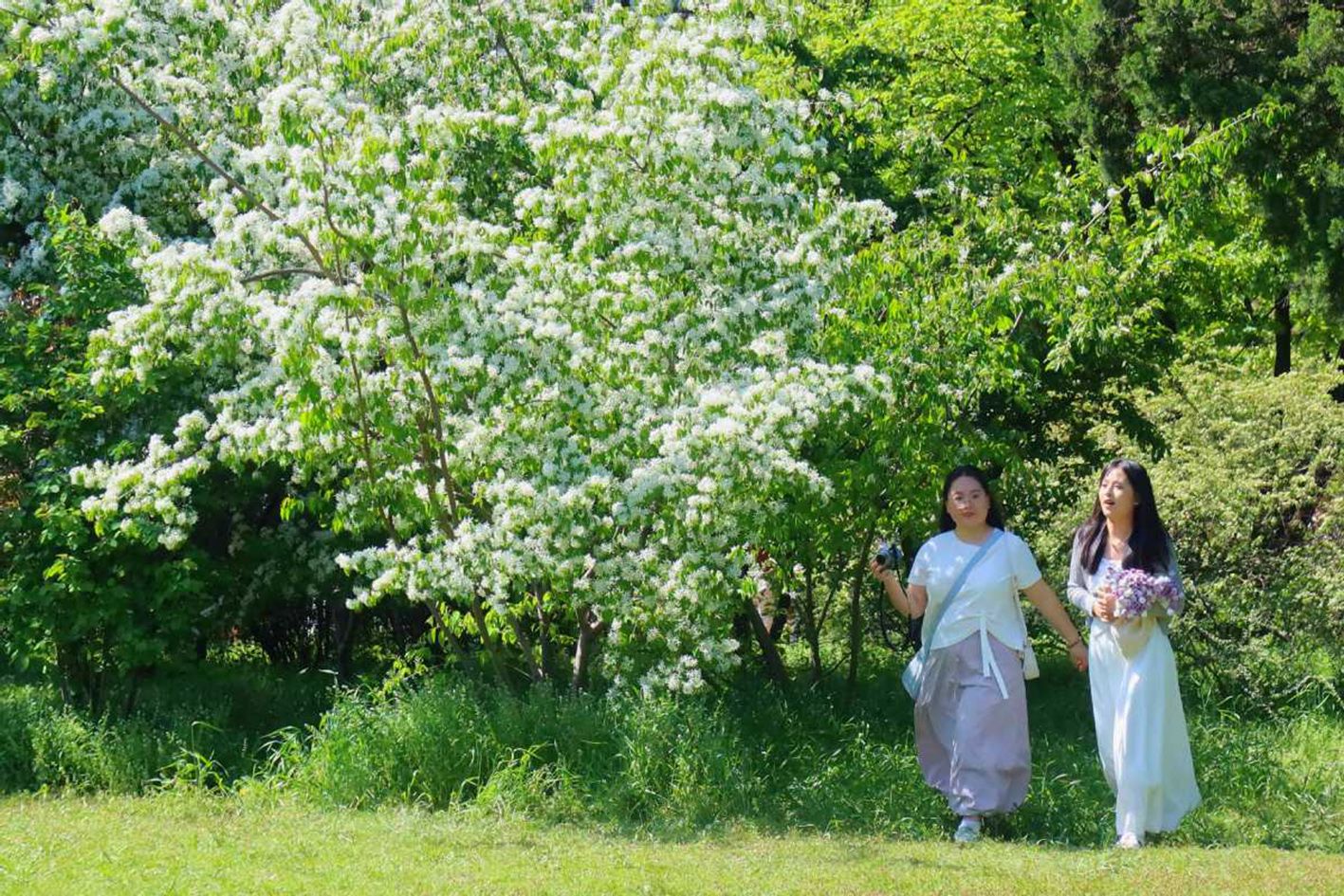 4月22日,在国家植物园南园的流苏大道,千株流苏树如期绽放,洁白如雪的花瓣随风飘落,为北京带来一场独一无二的“四月雪”。(中国日报网)
