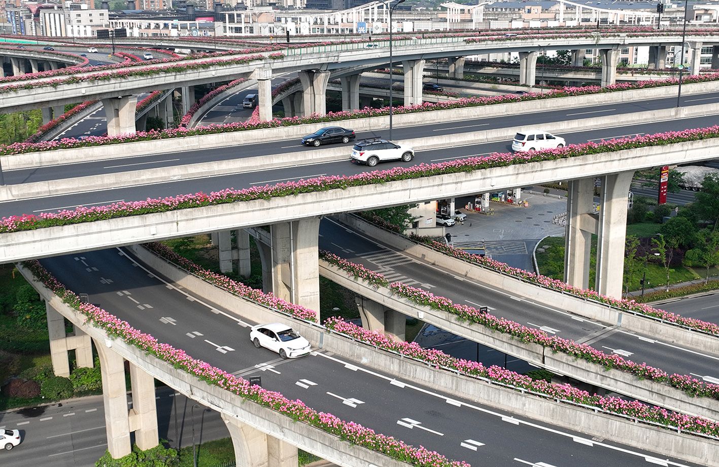 4月23日,车辆行驶在杭州小林互通的“月季花路”。近日,绵延在浙江杭州多条高架路上的数百万株月季迎来盛花期,造就美丽的“空中花廊”。(中新社)