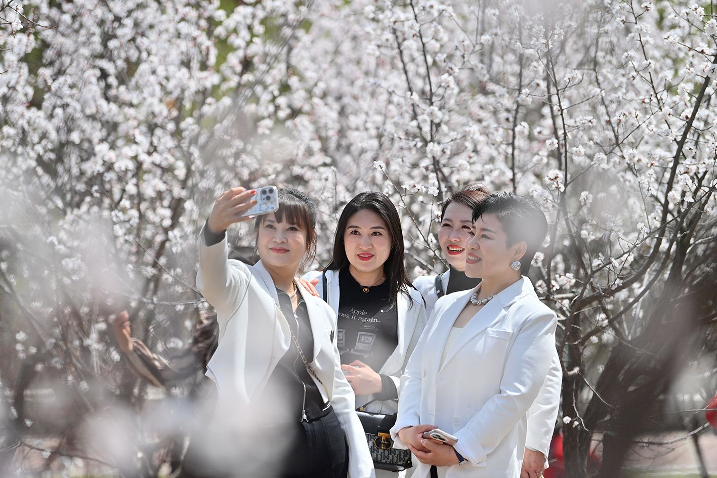 4月23日,游人在哈尔滨工程大学杏花长廊里拍照。近日,哈尔滨工程大学杏花长廊内粉色的杏花竞相绽放,吸引众多市民、游客前来拍照。每年4月下旬至5月上旬,校园内的杏花盛开,成为市民春季赏花的热门地点。(中新社)