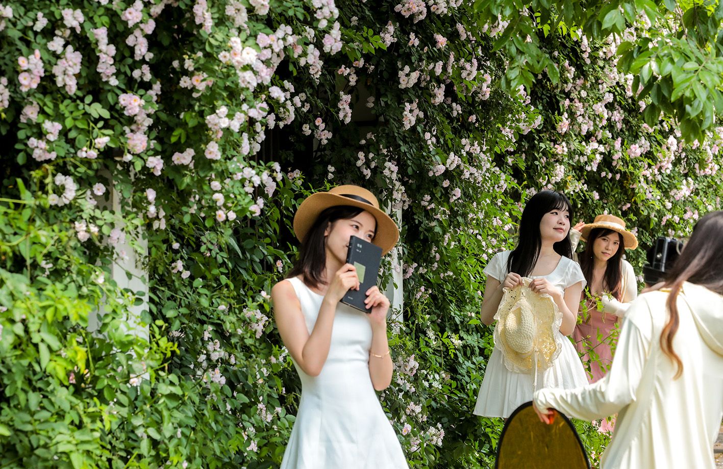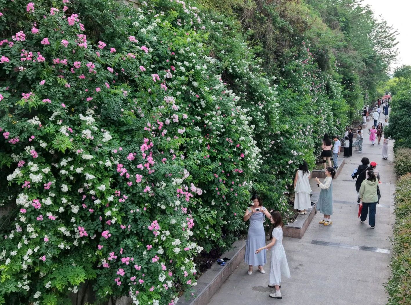 4月20日,在湖北省武汉市汉阳区晴川大道与锦绣二路交会处,一条百余米长的蔷薇花墙,成了远近闻名的网红打卡点。密布的花朵如瀑布般垂落,成为市民与游客争相打卡的“春日限定”美景。图为游客在蔷薇花墙前拍照。(中新社)