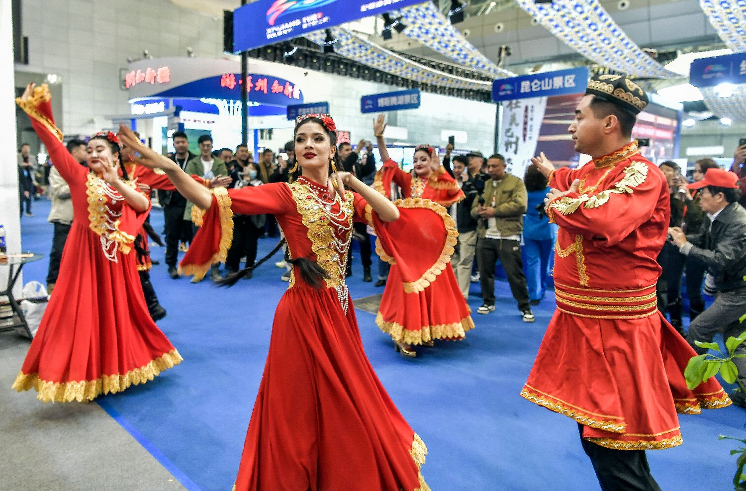 3月22日,新疆乌鲁木齐市,第六届新疆春季旅游博览会在新疆国际会展中心开幕。图为工作人员在场馆中跳起欢快的民族舞蹈。(图/中新社)