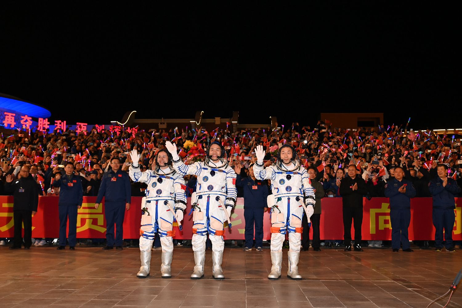 2024年10月30日,神舟十九号载人飞行任务航天员乘组出征仪式在酒泉卫星发射中心问天阁圆梦园广场举行。图为航天员蔡旭哲、宋令东、王浩泽在出征仪式上。(图/中新社)