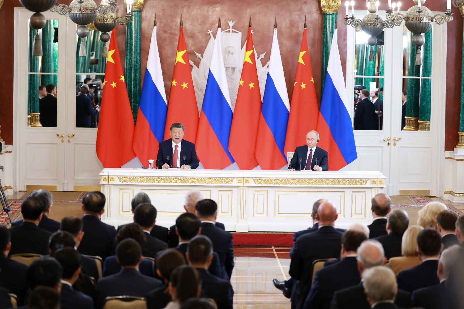 当地时间5月8日上午,俄罗斯总统普京同中国国家主席习近平在莫斯科克里姆林宫举行会谈。会谈后,两国元首共同会见记者。(图/中新社)