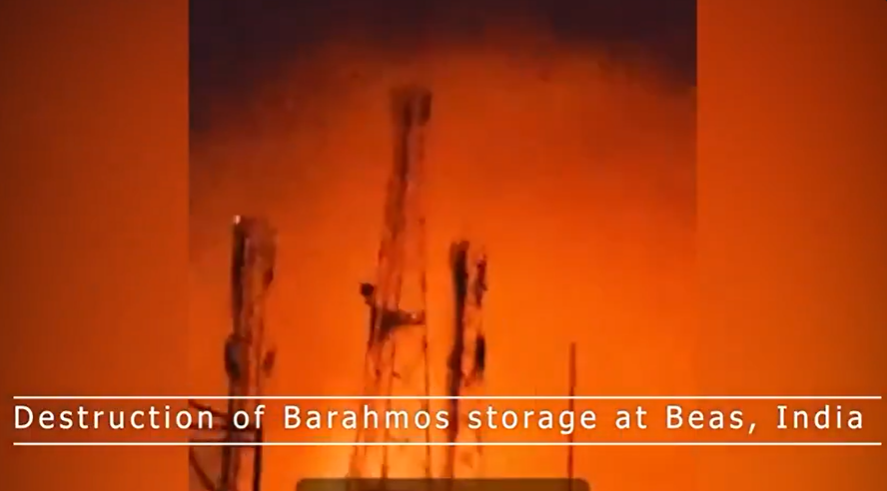 巴基斯坦国家电视台PTV10日发布的印度比亚斯地区一处“布拉莫斯”导弹存储点被摧毁的视频截图。