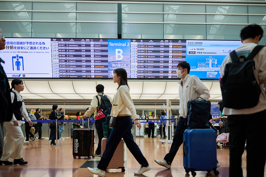资料图:日本东京羽田机场大厅,旅客经过航班信息面板。(视觉中国)