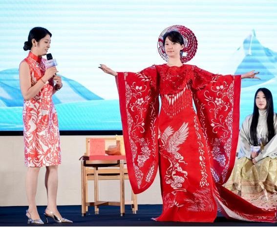 5月24日至26日,2025非遗视频创作大会在江西省上饶市婺源县举行。图为5月25日“非遗视频创作大师课暨经验交流分享会”现场,刘氏剪纸代表性传承人刘秀华展示将剪纸技艺与华服设计相结合的作品。(图/中新网)