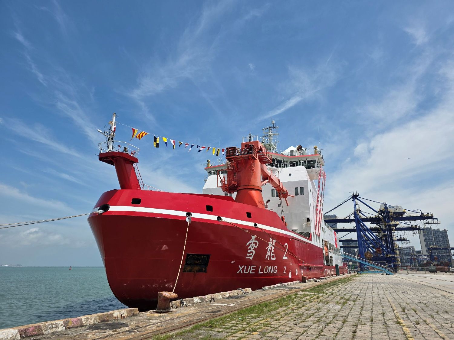 5月29日,“雪龙2”号极地科考破冰船停靠在海口市秀英港码头。(图/中新社)