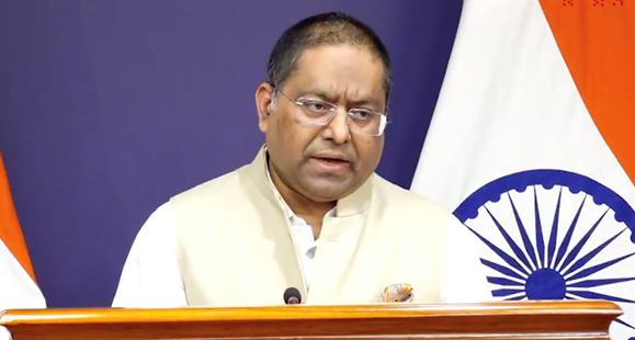 5月29日,印度外交部发言人兰迪尔·贾伊斯瓦尔在新闻发布会上发表讲话。图源:印媒