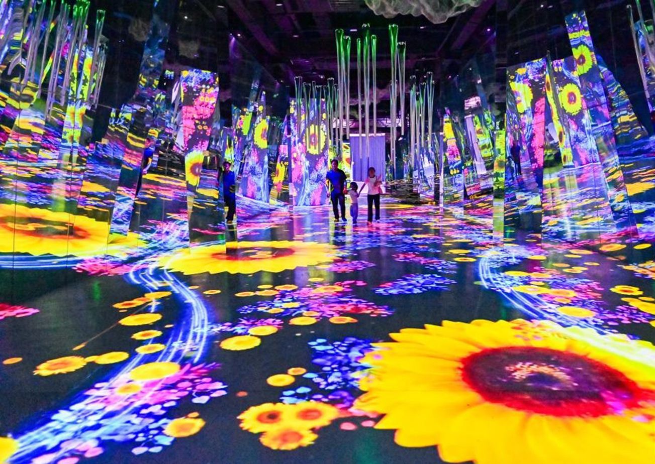 6月2日,游客在山东省青州古城景区“时空隧道”项目体验馆感受数字光影魅力。(新华社)