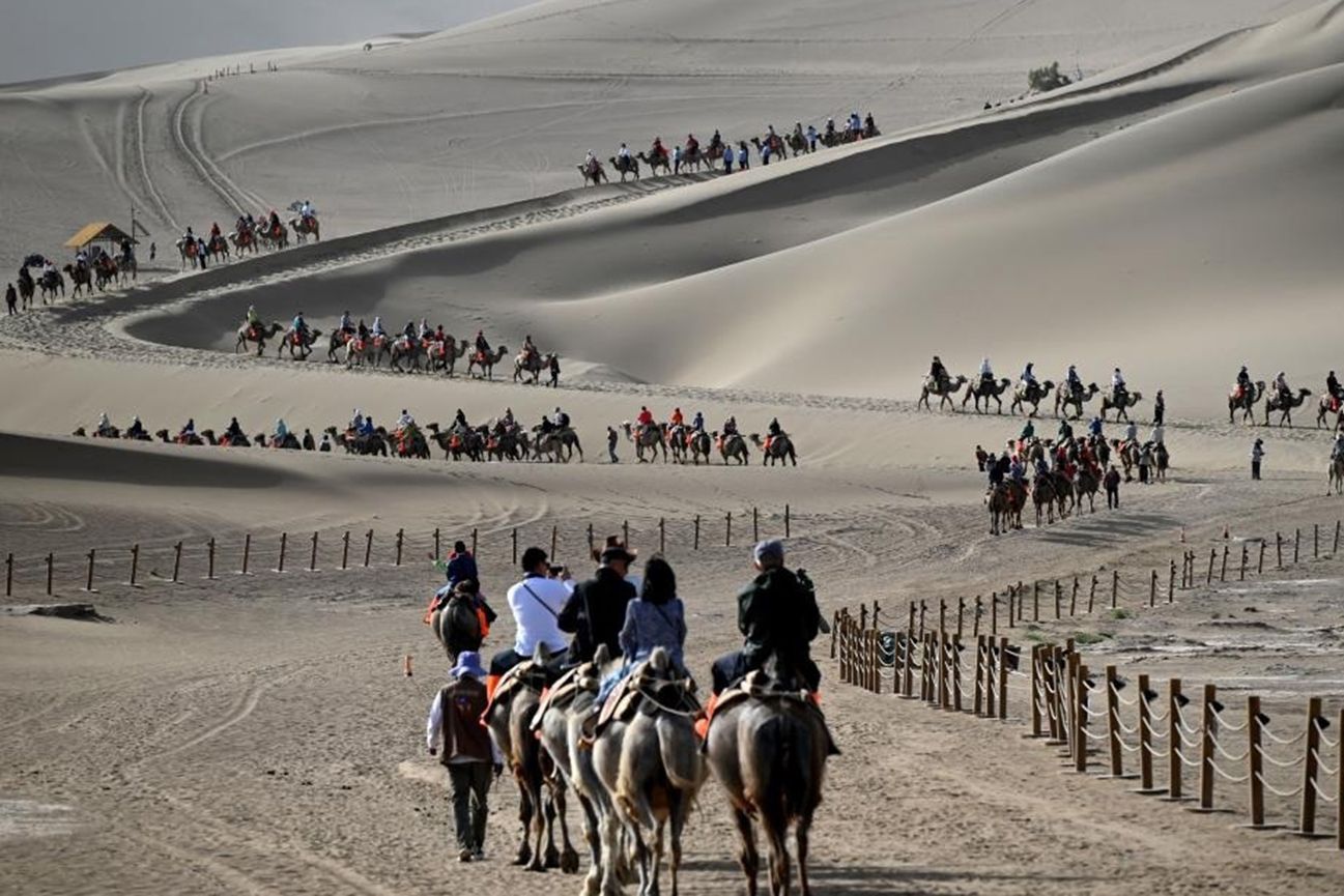 6月2日,游客在甘肃省敦煌市鸣沙山月牙泉景区游览。(新华社)