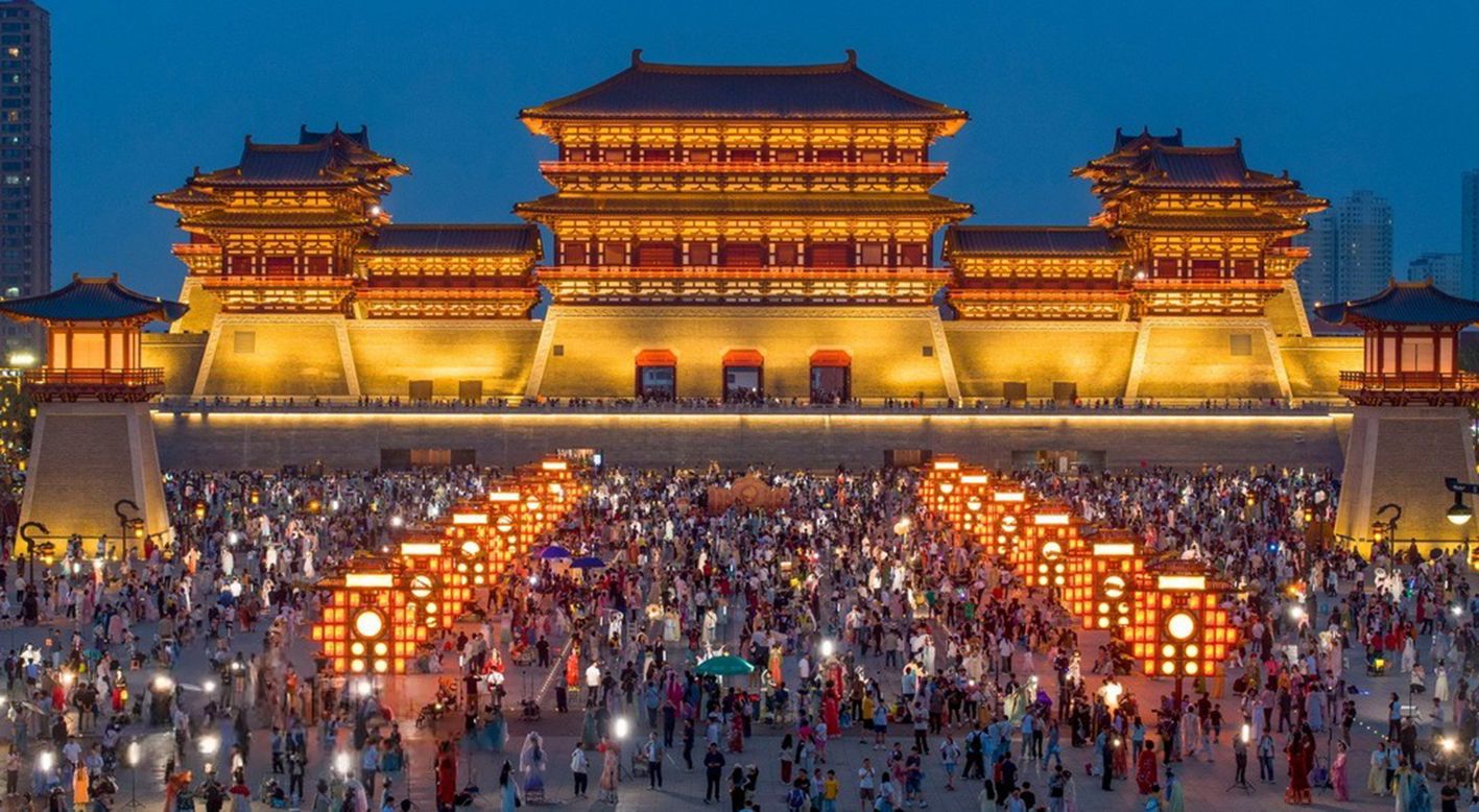6月1日是端午假期第二天,河南省洛阳市隋唐洛阳城景区灯火璀璨,游客络绎不绝。(人民网)