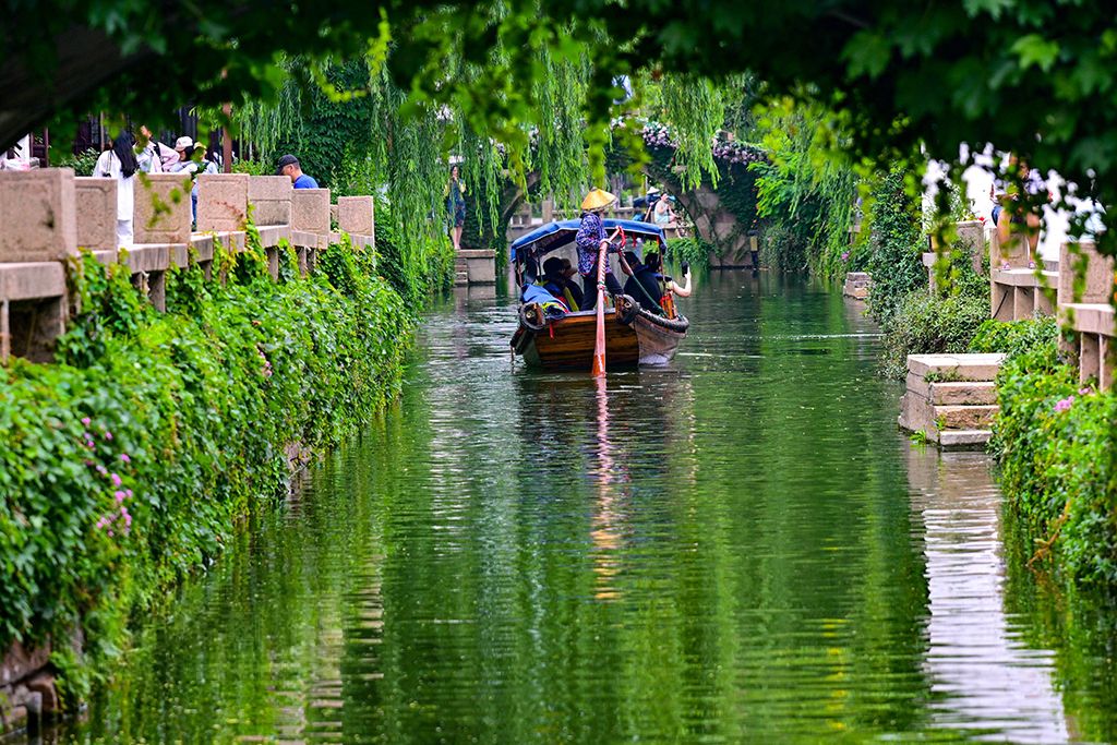5月31日,江苏省昆山市周庄古镇景区,游客乘坐摇橹船游览古镇水乡,感受水乡魅力,乐享端午假期。(人民网)