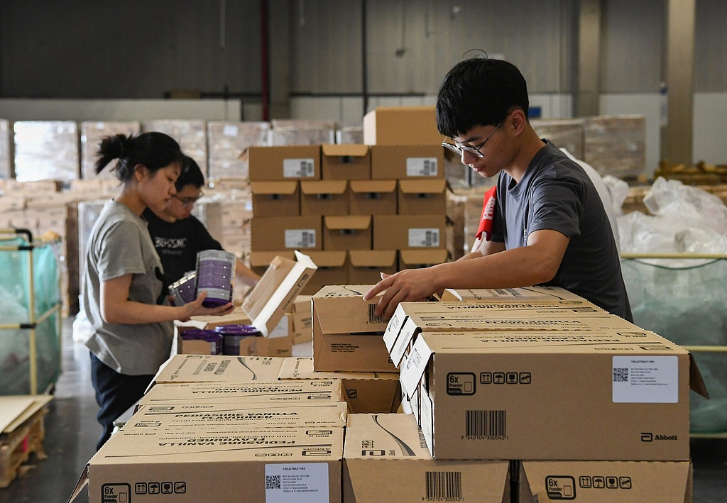 5月16日,浙江省金华市跨境电商企业工作人员分拣商品。(视觉中国)