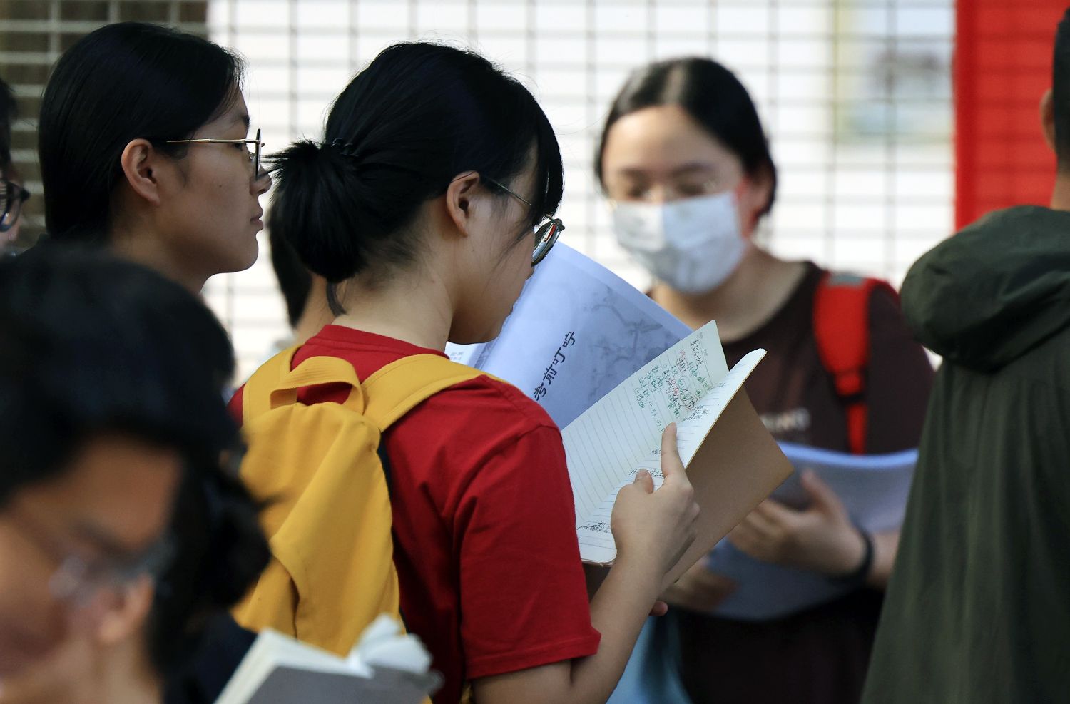 2025年6月7日,北京市第八中学考点外,考生们在做考前复习。卞亚文/摄