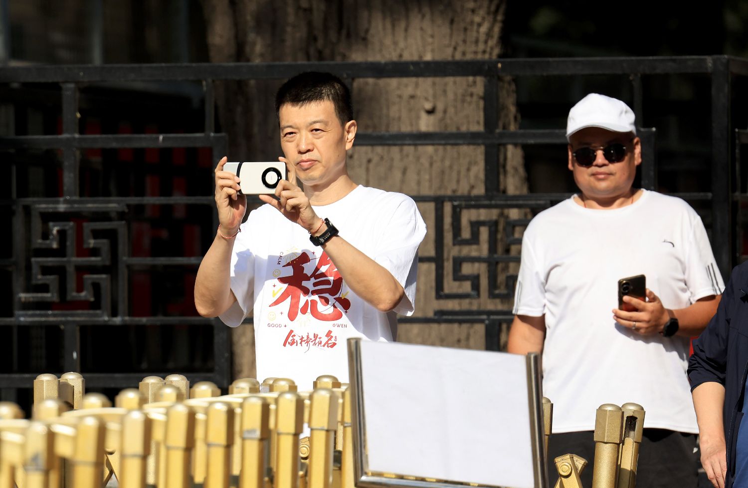 2025年6月7日,一名身穿“稳”T恤的考生家长在北京市第八中学考点外持手机记录现场。卞亚文/摄