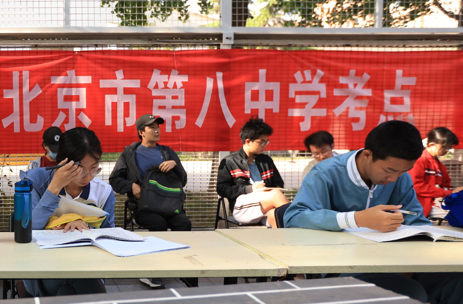 2025年6月7日,开考前,考生在北京市第八中学考点外做考试复习。 卞亚文/摄