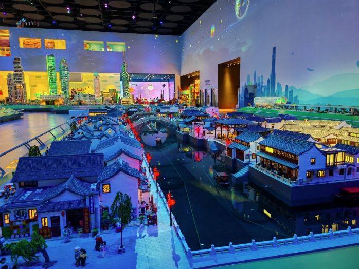 乐高中心大楼的大厅里,由乐高积木拼搭出中国多个城市的壮丽景观,图为枫泾古镇的景色。(图/中新社)