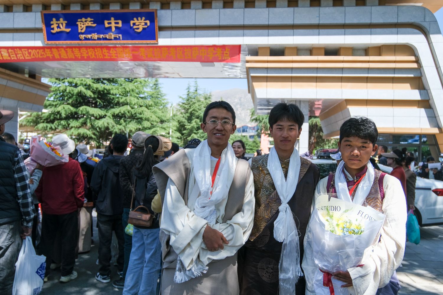 2025年西藏自治区高考共有3.6万名考生,全区共设10个考区41个考点,考试时间为6月7日至9日。在拉萨中学考点,不少家长手捧鲜花在外等待,鲜花上的卡片写满了祝福语。考试结束后,家长们纷纷为考生们献上哈达、鲜花等。