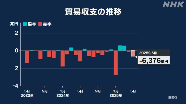(亚太快讯消息)据NHK报道,根据日本财务省公布的5月份贸易统计数据,出口减去进口后的贸易收支出现6376亿日元的赤字。