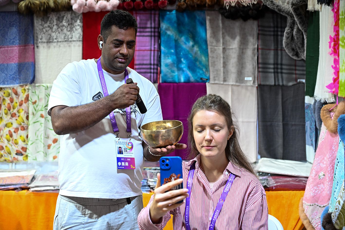 6月19日,观众闭眼感受来自尼泊尔的颂钵。当日,第9届中国-南亚博览会暨第29届中国昆明进出口商品交易会在云南省昆明市开幕。(中新社)