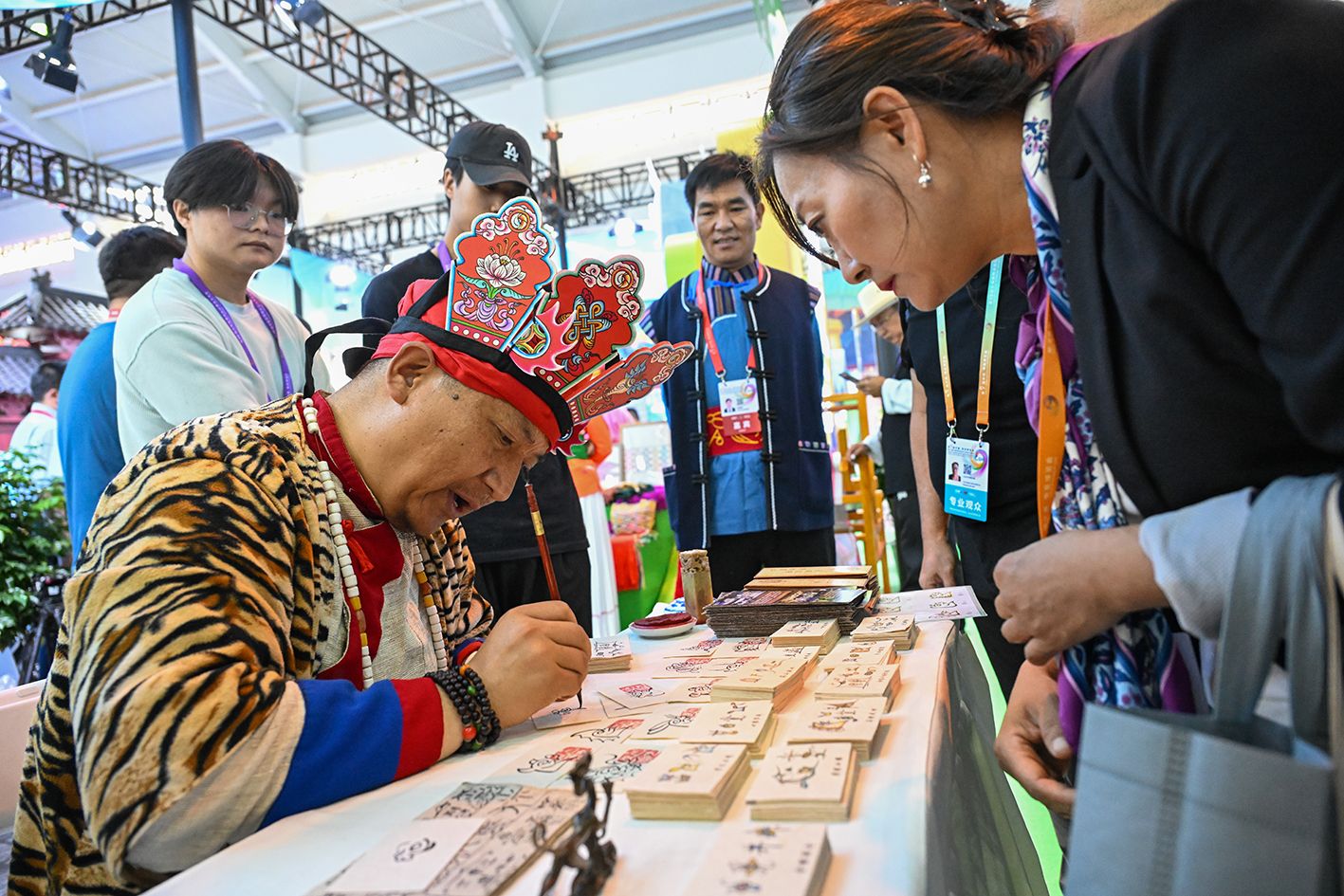 6月19日,云南丽江东巴文吸引观众。当日,第9届中国-南亚博览会暨第29届中国昆明进出口商品交易会在云南省昆明市开幕。(中新社)