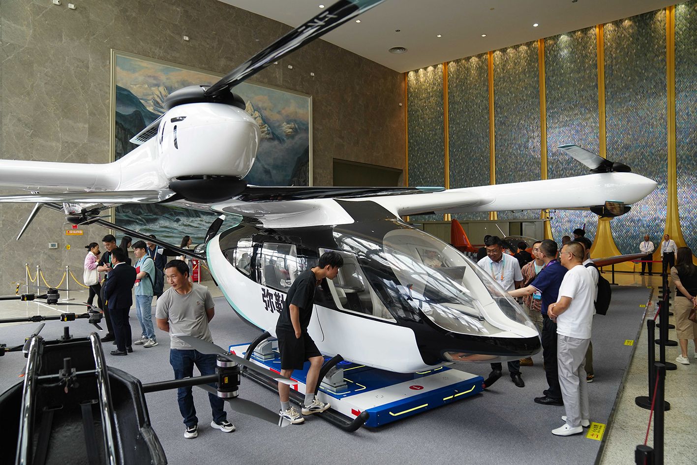 6月19日,一架电动载人垂直起降飞行器吸引观众。当日,第9届中国—南亚博览会暨第29届中国昆明进出口商品交易会在昆明开幕,低空经济企业携产品亮相,展示行业前沿成果,吸引观众目光。(中新社)