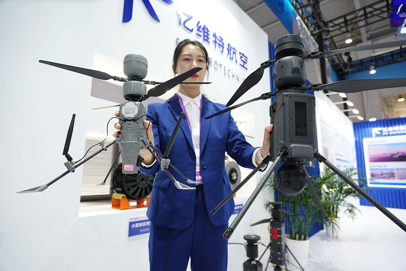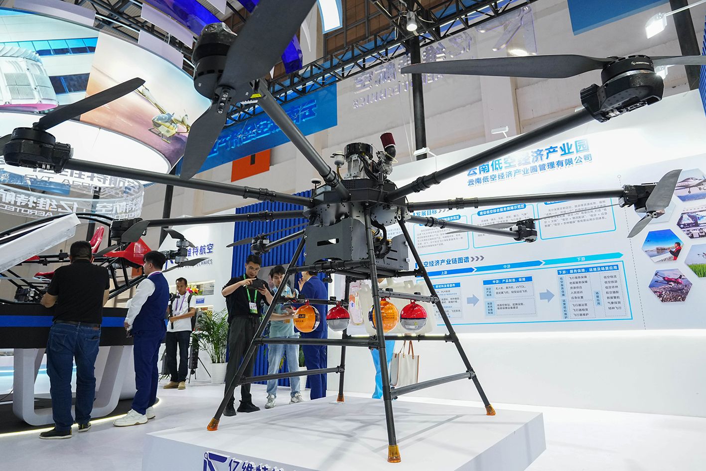 6月19日,消防灭火油电混动长航时无人机吸引观众。当日,第9届中国—南亚博览会暨第29届中国昆明进出口商品交易会在昆明开幕,低空经济企业携产品亮相,展示行业前沿成果,吸引观众目光。(中新社)