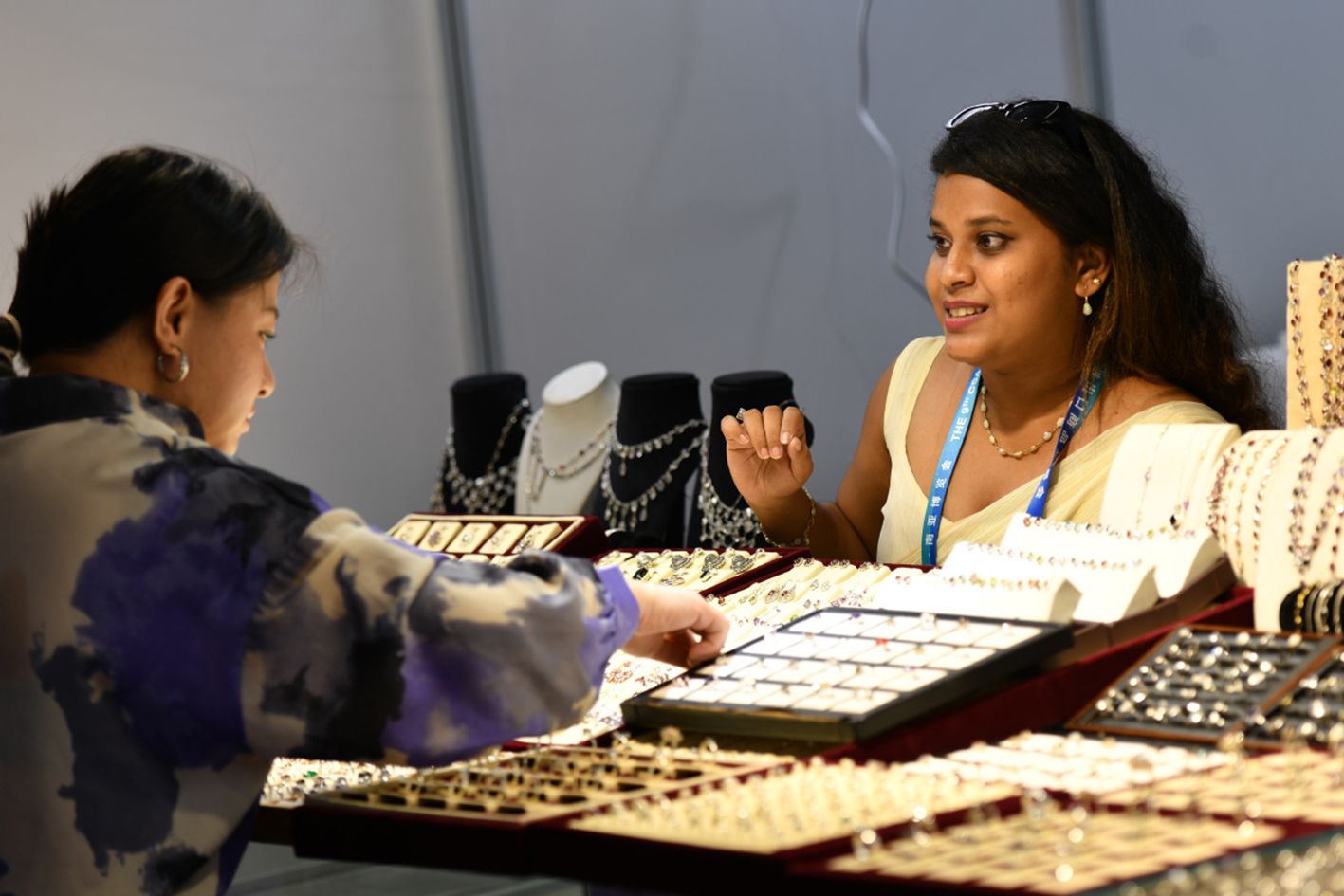 6月19日,在第9届中国—南亚博览会,斯里兰卡展区的展商(右)向顾客推介特色饰品。(新华社)